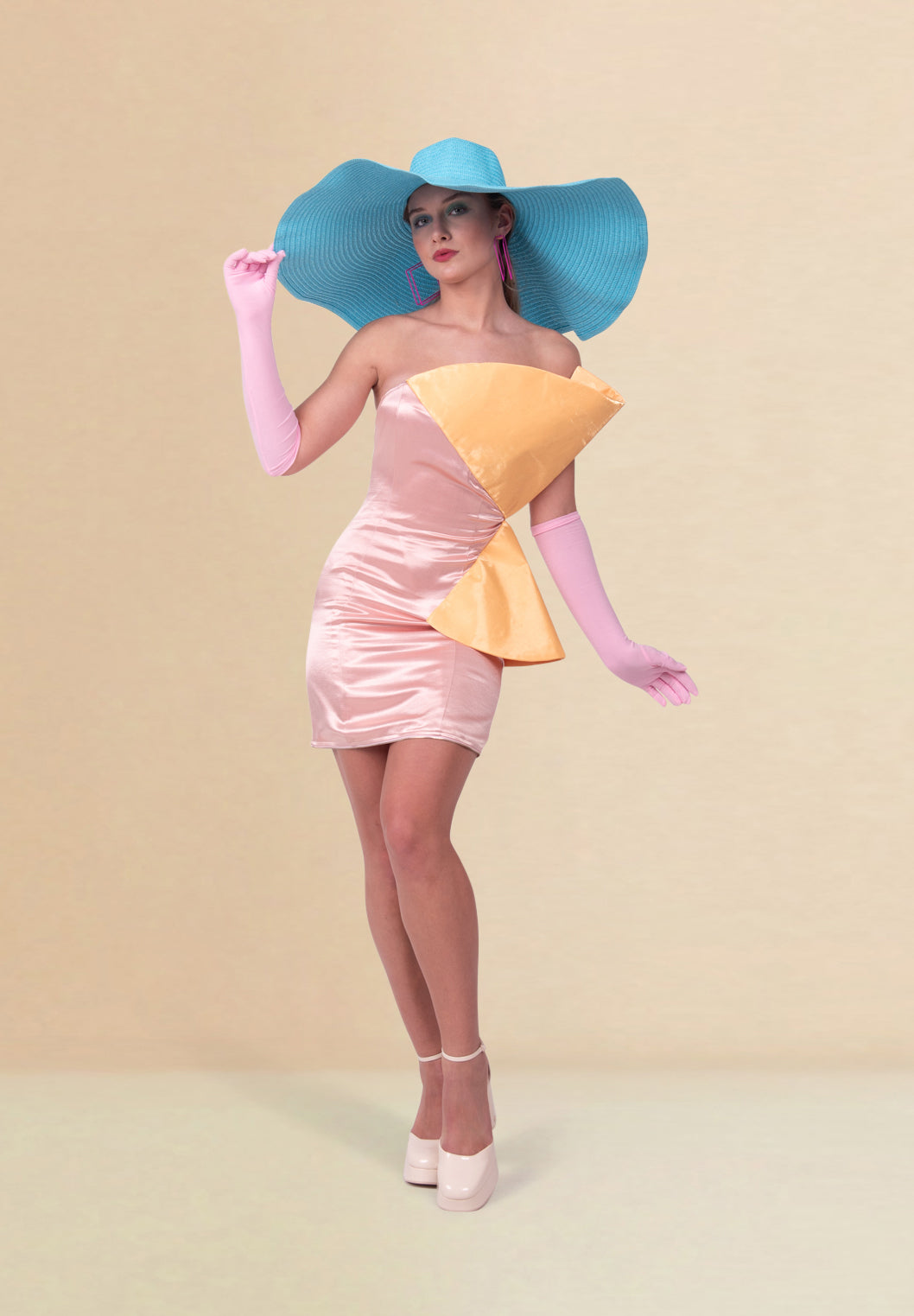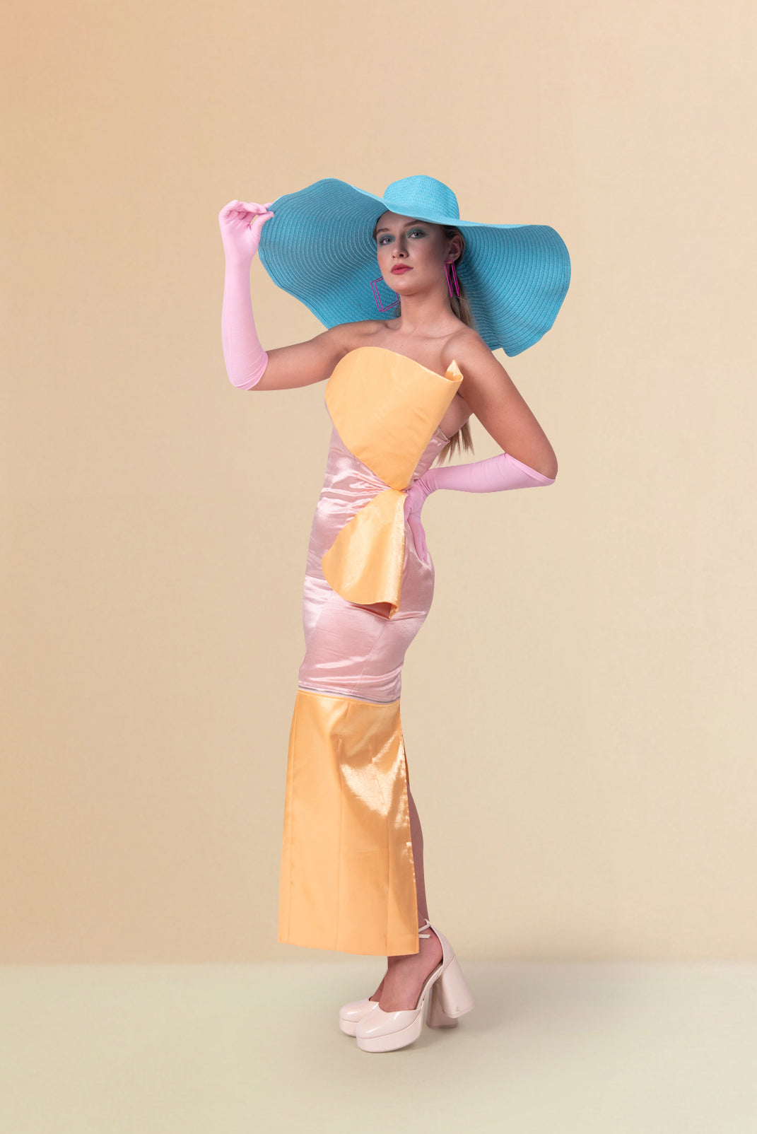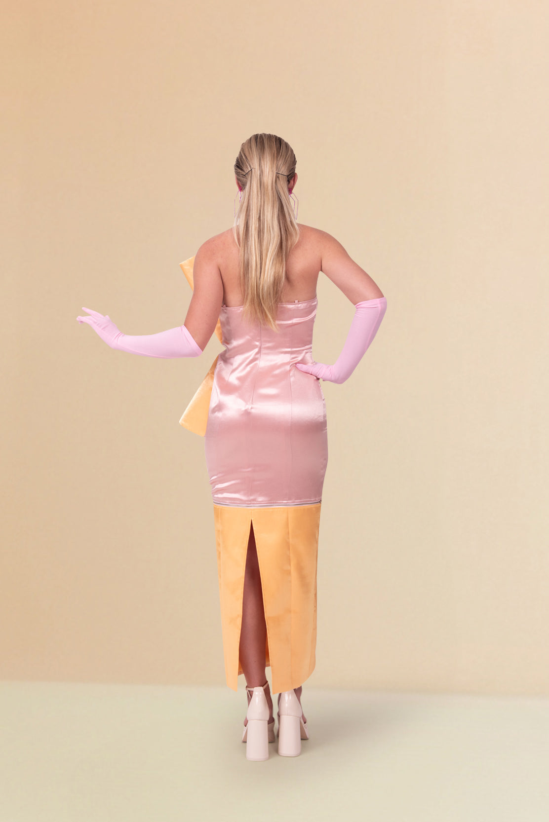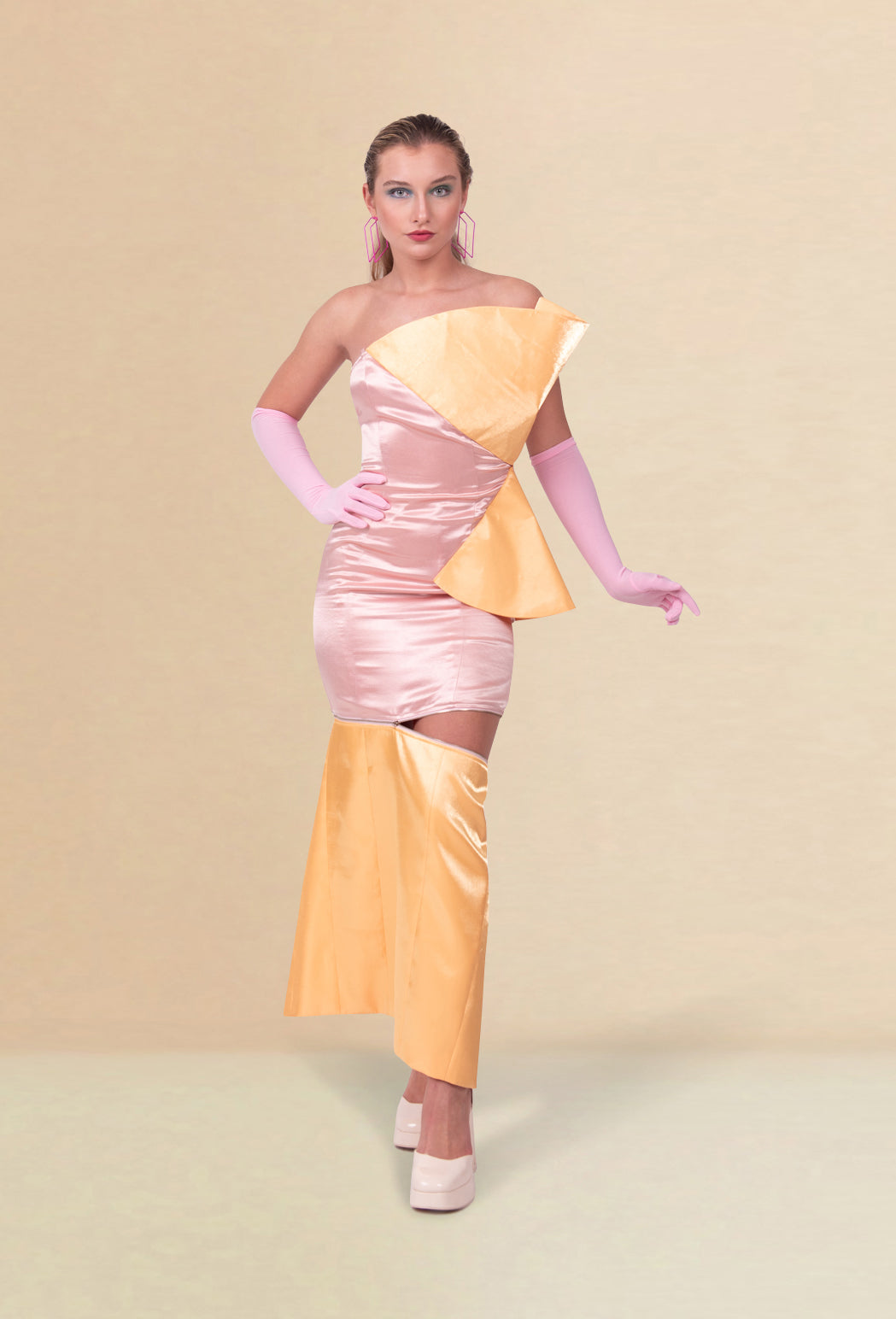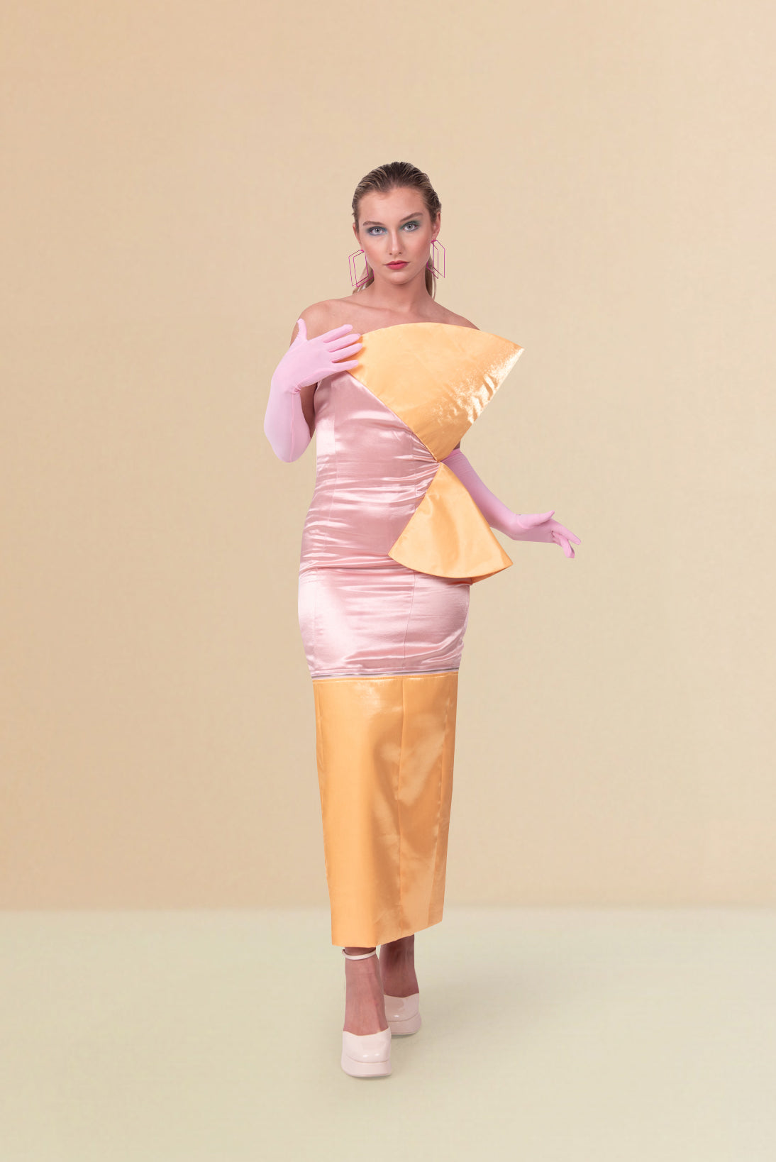 Color Block Detail: The asymmetrical design highlights the contrasting colors, adding dimension and visual interest to the look. The blush and orange combination brings a modern, playful touch to the refined silhouette.
