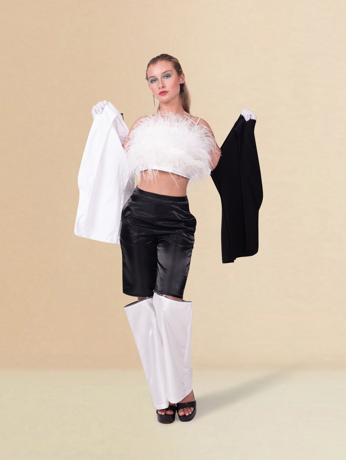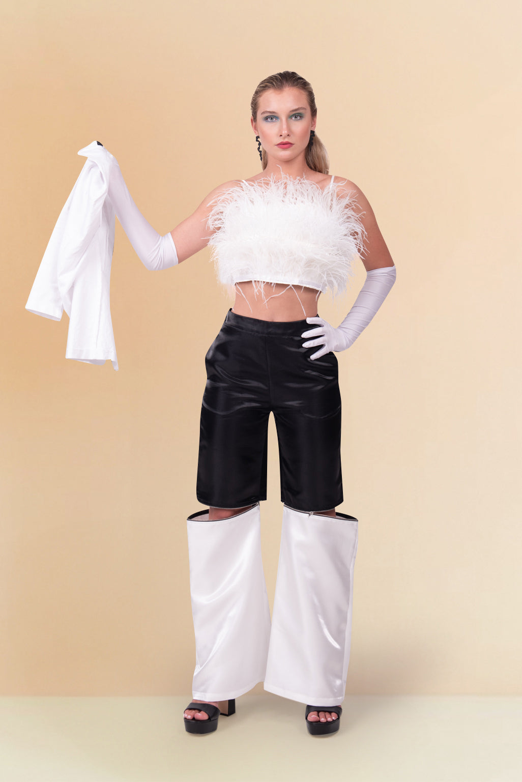 Step into versatility with the "Convertible Two-Tone Trousers," an innovative design that allows you to transition effortlessly between long and short styles. These trousers feature a sleek black and white design with zippers that transform the pants from knee-length shorts to full-length trousers. Crafted from polyester acetate fabric, they offer a modern look that’s perfect for both events and everyday wear.