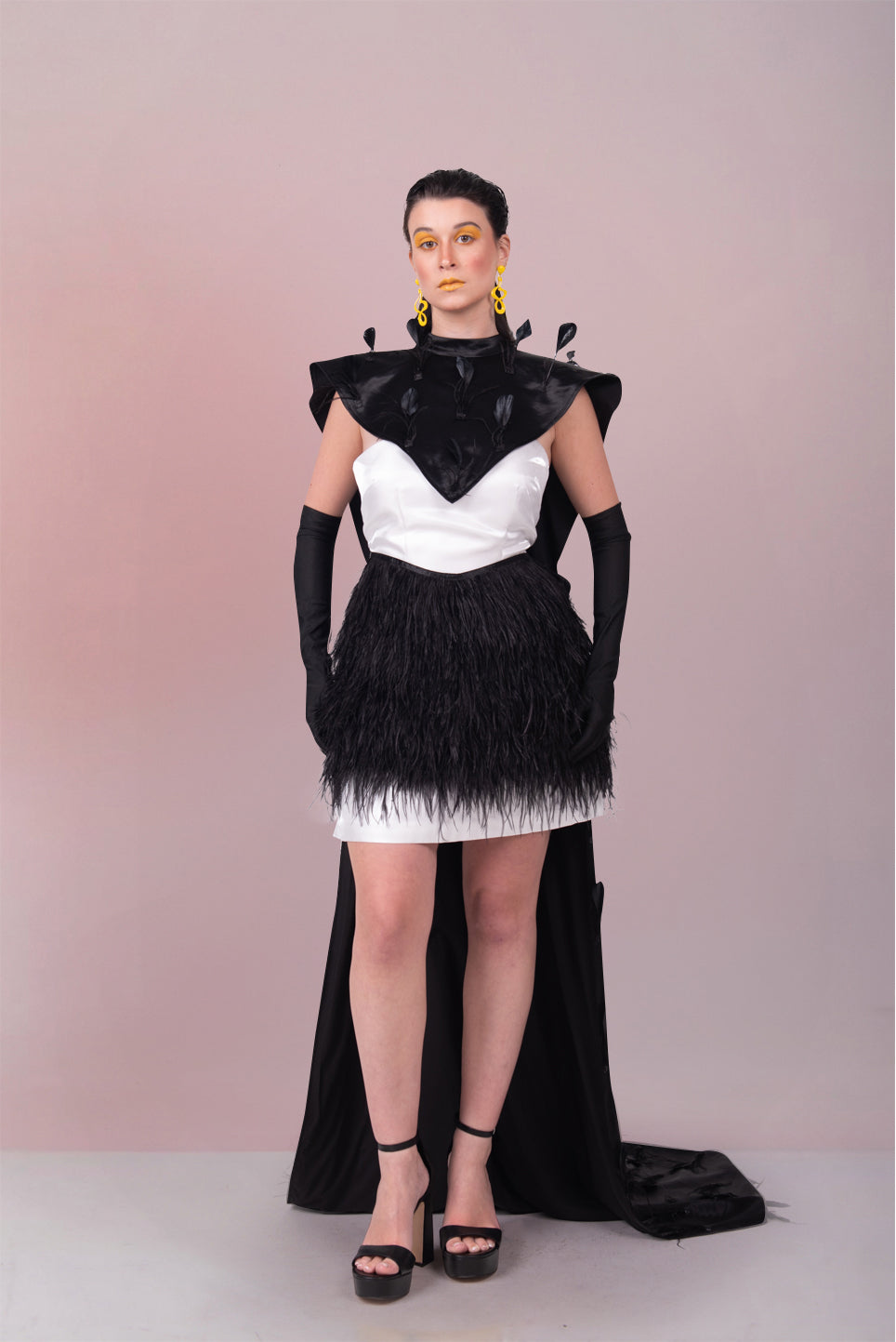 Elevate your look with the "Feathered Cape Couture Trio," an avant-garde three-piece ensemble featuring a striking cape, a sleek white dress, and optional feather detailing. The dress, crafted from polyester acetate, offers the versatility to be worn with or without the detachable feather accents, allowing you to adjust the style for different occasions. The dramatic cape, also made from polyester acetate, completes the look with a bold, flowing silhouette that zips at the back for an easy fit. Both pieces are designed to make a bold statement, whether worn together or separately.