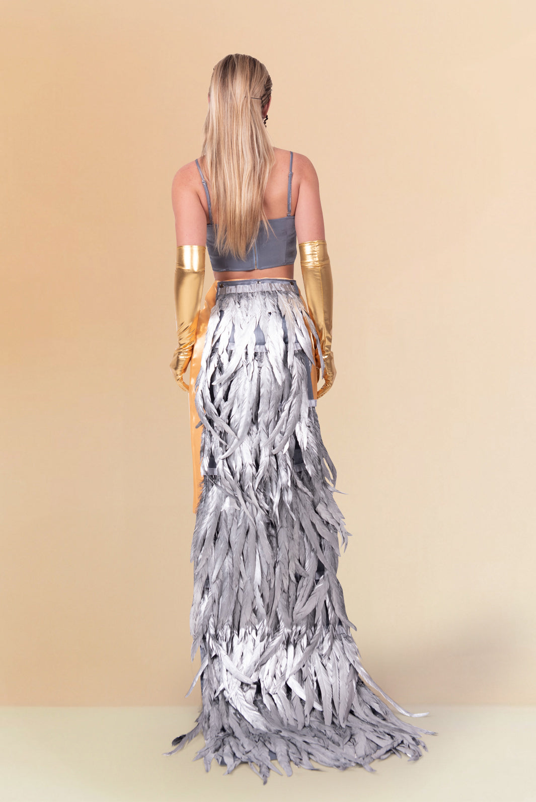 Elevate any ensemble with the "Feathered Drama Veil," a striking detachable piece that combines elegance and avant-garde design. Made from luxurious polyester fabric and adorned with soft, flowing feathers, this veil adds high-fashion impact to any outfit. The veil can easily be attached or removed, offering versatility for a dramatic flair at any event.
