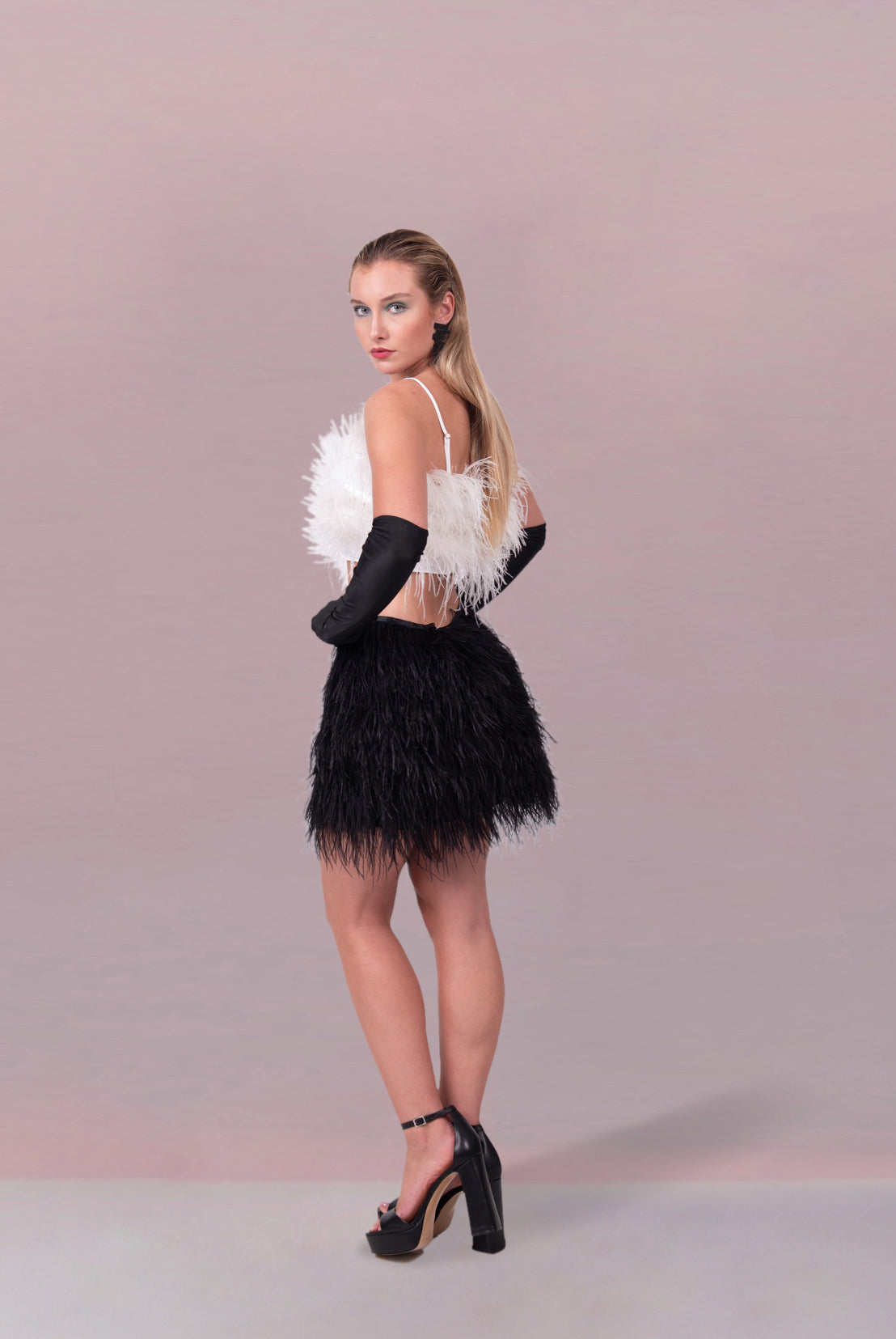 Embrace chic sophistication with the "Feathered Elegance Skirt," a stunning piece designed to make a statement. This exquisite black feather skirt features a sleek zipper on the side and is fully lined for comfort and elegance. Perfect for elevating any outfit, this skirt pairs beautifully with a variety of tops, making it a versatile addition to your wardrobe. The delicate feather detailing adds a touch of glamour, ideal for special occasions or a night out.
