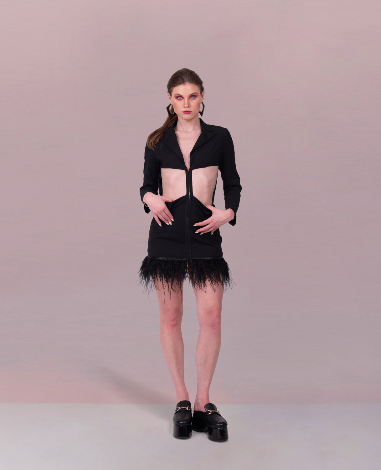 Make a bold statement with the "Feathered Elegance Dress," an exquisite piece designed for the modern fashionista. This stunning black dress features a striking bottom adorned with luxurious ostrich feathers that add a dramatic flair, ensuring you stand out at any event.